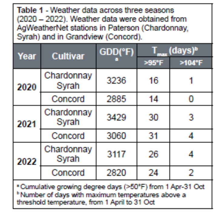 Over three years (2020-2022), we analyzed nutrient levels of harvested fruit from three different cultivars: Chardonnay, Syrah, and Concord. The Syrah and Chardonnay vineyards, which are located in Paterson, WA, received on average an additional 339°F of seasonal growing degree days (GDD) compared to the Concord vineyard located in Sunnyside, WA (Table 1).