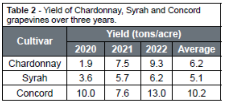 For each cultivar, the yield varied among years, with the highest yields in 2022. On average across the three years, the yield for Syrah, Chardonnay and Concord was 5.1 tons/acre, 6.2 tons/acre, and 10 tons/acre, respectively (Table 2).