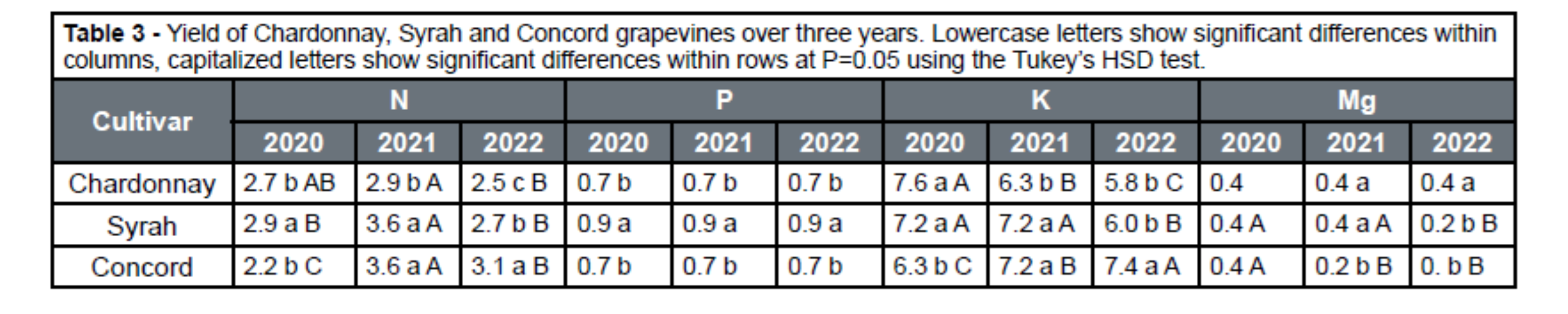 The wine grapes contained the lowest amount of N in 2022 and the highest amount in 2021, while the least N in juice grapes was recorded in 2020. The juice grapes also contained more N and K than the wine grapes in 2022, while in 2020 N and K were lower in juice grapes compared to wine grapes. While P removal was consistent across the years, more P was generally removed from the Syrah vineyard compared to Chardonnay and Concord. The fruit Mg concentration was the same for all three cultivars during 2020 and did not change for Chardonnay throughout the years; however, Mg was slightly lower in Concord grapes in 2021 and 2022, and in Syrah during 2022.