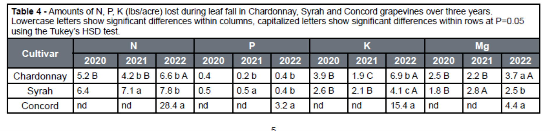 Juice grapes typically have much larger canopies than wine grapes, so they potentially lose more nutrients during leaf fall. With the exception of P, nutrient losses via leaves in wine grapes seem to be higher in late growing seasons when leaves are green until they are killed by the first frost (as was the case in 2022). Foliar K was especially responsive to seasonal differences, being much lower after the long 2021 fall and higher in 2022 when frost killed green leaves.