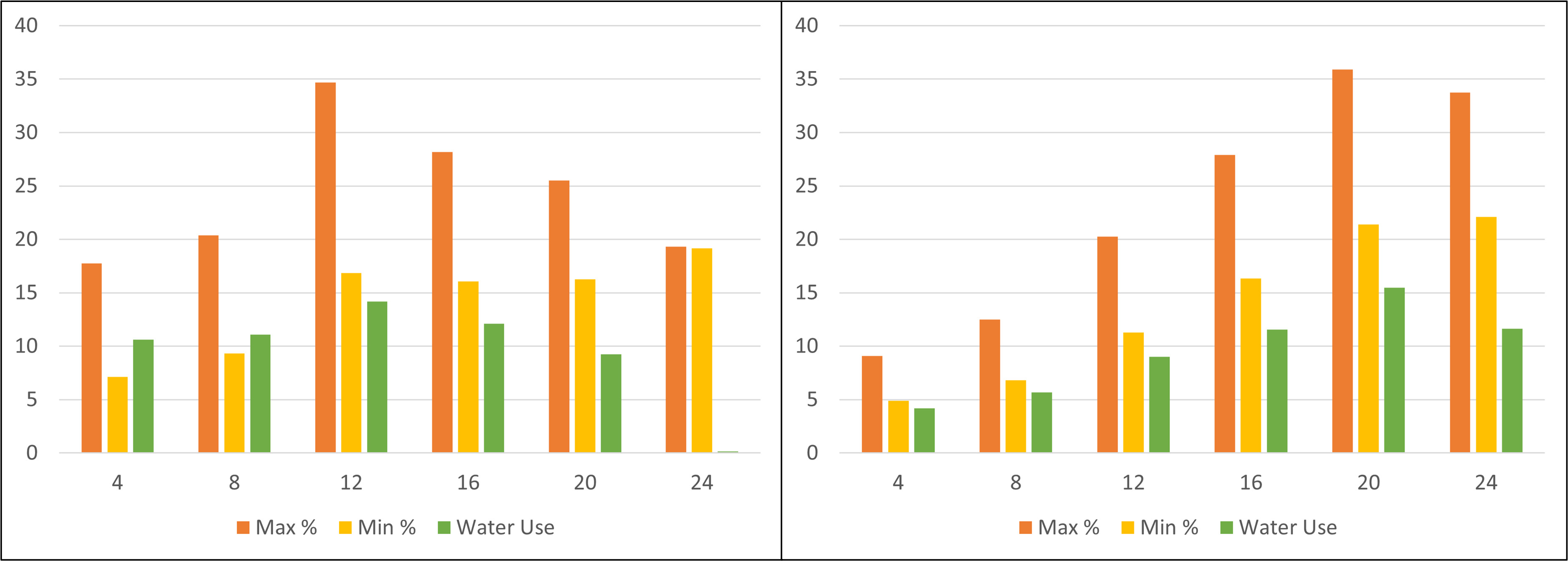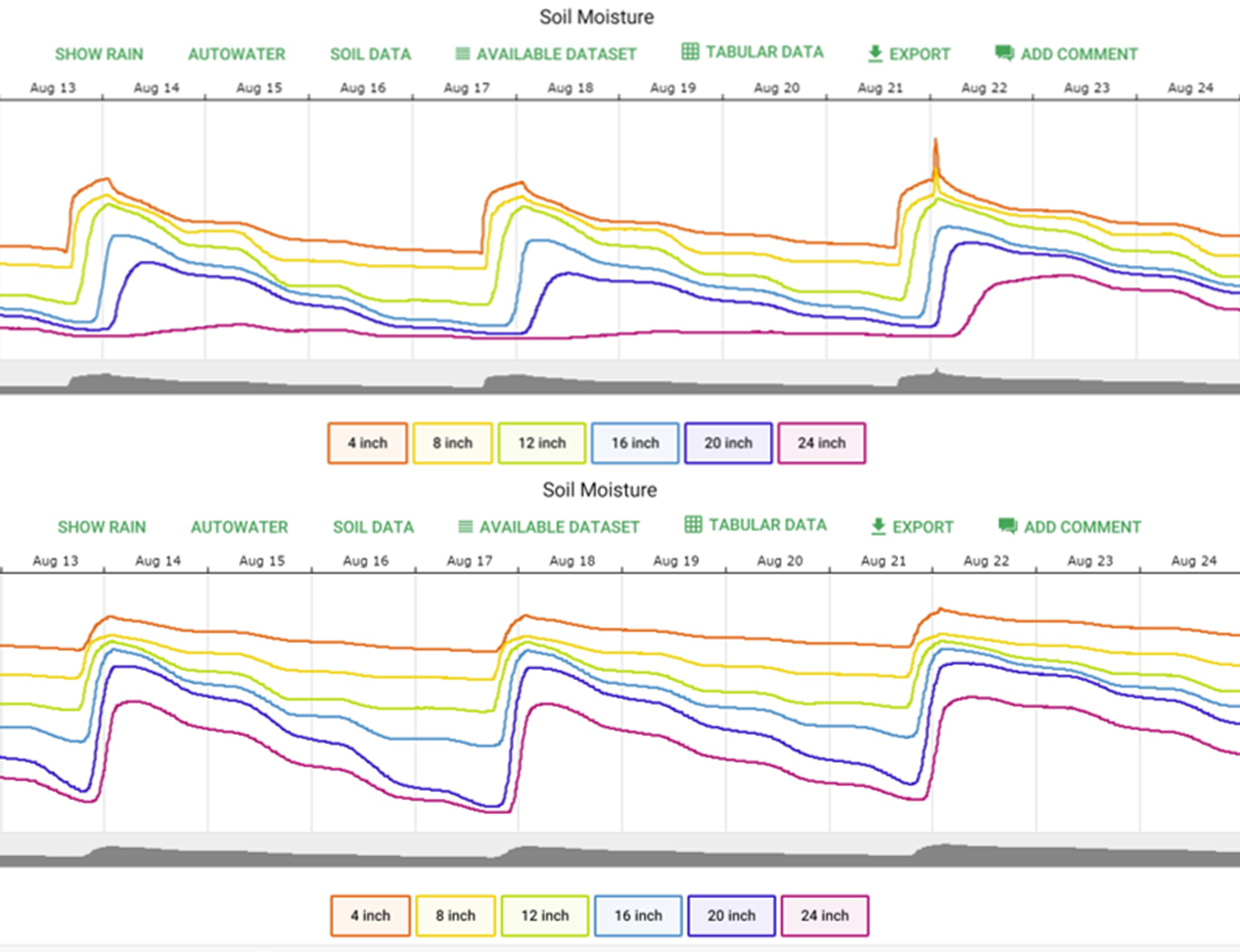 Figure 2 displays the soil water content in a bar graph with maximum soil water content shown in orange, lowest soil water content shown in yellow, and the difference shown in green. The latter amount represents potential water use between irrigation events.